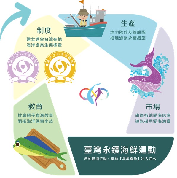 因此,我們發起「台灣永續海鮮運動」,鼓勵民眾發揮消費力量,積極購買與選擇食用友善台灣沿近海生態的魚蝦貝類,或漁業管理良好的海鮮。為了讓民眾在日常生活中有更多機會享用台灣永續海鮮,我們邀請店家合作響應「台灣永續海鮮運動」,長期使用符合台灣永續海鮮條件的食材作為料理,期盼以此鼓勵更多台灣漁民投入漁業永續的行列,從產銷帶動台灣社會往永續海洋的目標邁進。