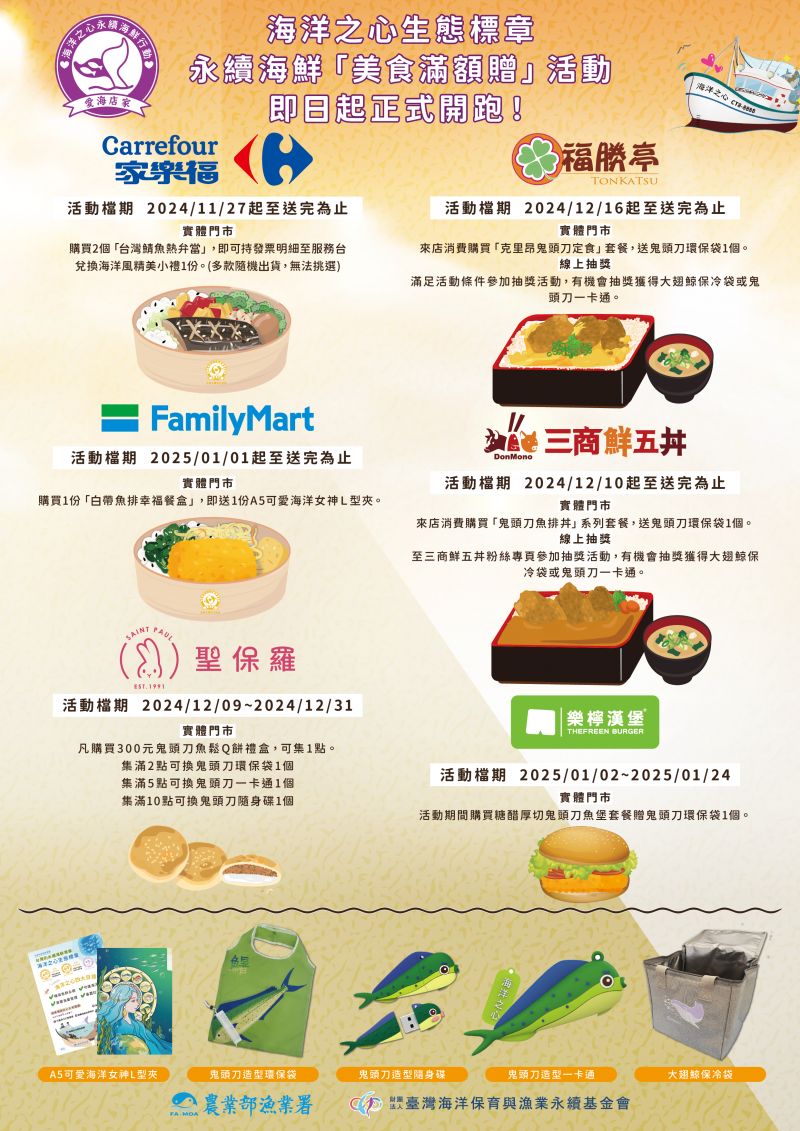 【公告】海洋之心生態標章永續海鮮「美食滿額贈」活動,即日起正式開跑!