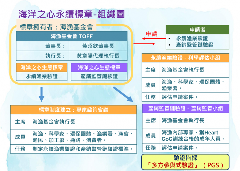 海漁基金會乃「海洋之心永續標章」的擁有者,並和農業部漁業署共同推動。在「漁業驗證」方面,歡迎全台沿近海漁業以一漁法搭配一魚種的形式依不同類別的漁業驗證標準申請認證;在「產銷監管鏈驗證」方面,歡迎第二級產業的加工廠、中央廚房及第三級產業的餐廳店家申請驗證。